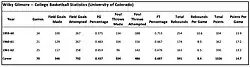 At the time of his graduation in 1962, with 1,026 total points scored over three seasons, Wilky Gilmore was the second-highest scorer in Colorado Buffaloes team history.[11] Despite his many accomplishments in his three years of varsity basketball with the Buffaloes, Gilmore's play was definitely affected in his last season and a half by the nagging effects of his knee injury: As a Sports Illustrated in December 1961 article put it, "Much of Colorado's substantial hope rests on the slow-healing knee of fast Wilky Gilmore, the team's best shot."[12]