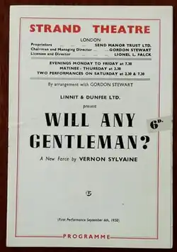 Will Any Gentleman? is a 1950 stage farce by the British writer Vernon Sylvaine.[1] The play was first performed at the Royal Court Theatre in Liverpool in July 1950. It then went on to the West End, running for 364 performances at the Strand Theatre between September 1950 and July 1951.[2] It starred Robertson Hare, who appeared in several plays by Sylvaine. Hare plays a mild-mannered bank clerk who, after a night out, is hypnotized into a much more assertive lifestyle.