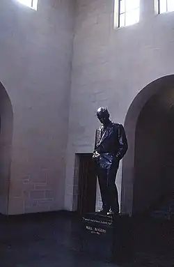 The rotunda contains a famous sculpture of Will Rogers by artist Jo Davidson. The pedestal is inscribed with a famous quotation by Rogers, "...I never met a man I didn't like." The statue is another cast of the work that the artist created in 1938 and which has represented the state in the National Statuary Hall at the United States Capitol.[3]
