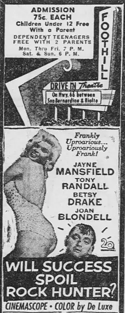 Will Success Spoil Rock Hunter? is a 1957 American satirical comedy film starring Jayne Mansfield and Tony Randall, with Betsy Drake, Joan Blondell, John Williams, Henry Jones, Lili Gentle, and Mickey Hargitay, and with a cameo by Groucho Marx.[3][4] The film is a satire on popular fan culture, Hollywood hype, and the advertising industry, which was profiting from commercials on the relatively new medium of television. It also takes aim at the reduction television caused to the size of movie theater audiences in the 1950s. The film was known as Oh! For a Man! in the United Kingdom.