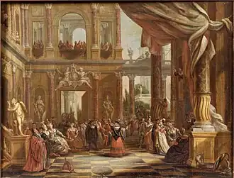 An early Flemish painting tradition of depicting ball scenes had been developed by the Antwerp painter Hieronymus Janssens, who himself may have been inspired by Rubens' garden of love paintings.[9] The painter Jacobus Ferdinandus Saey regularly painted the fantastic architecture for Hieronymus Janssens' ball scenes.[10] Antwerp painter Jacob Balthasar Peeters, whose work must have been familiar to van Minderhout as he was a pupil of his father, also painted fantastic architectures with elegant figures in exotic costumes.[11] In addition to these homegrown sources, van Minderhout may also have drawn inspiration for his masquerade pictures from Claude Gillot's prints of comedia dell'arte scenes, and the work of the Flemish painter Hendrick Govaerts from Antwerp, who was also active in Central Europe.[8]