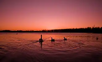 The lake is surrounded by a mixture of open parkland and woodland, which forms part of the wider Ouzel Valley Park.[11] The lake is divided by an embankment and bridge carrying the A509 (H5 Portway), which runs between the east and west of the city, providing links to M1 Junction 14 (approximately 1 mile (1.6 km) to the north-east), and Central Milton Keynes and the A5 (approximately 1.5 miles (2.4 km) and 2.5 miles (4.0 km) to the south-west, respectively).