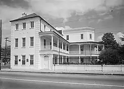 The Aiken House is located at the corner of King and Ann Streets on the west side of the main section. It is an 1807 Federal Adamesque wood-frame house, two stories high, with a two-story porch extending across its southern facade. It is where the South Carolina Canal and Rail Road Company was founded in 1827, with William Aiken, an Irish immigrant, as its first president. Construction of the railroad line took place between 1830 and 1833, marred by the death of Aiken when horses drawing his carriage were frightened by construction-related noises, overturning it, and also by the explosion of the Best Friend of Charleston, the first American-made steam locomotive. When it began operation, it had the greatest length of track (136 miles (219 km)) in the world under single management.[3] In 1929, the Southern Railway, which had taken possession of the house with its acquisition of the South Carolina Canal and Rail Road Company, removed several decorative elements such as a fireplace mantel from the Aiken House and used them in the executive offices of the Southern Railway Building, its Washington, D.C. headquarters.[5]