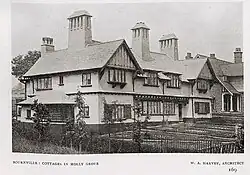 Influenced by the Arts and Crafts Movement, many of Harvey's designs incorporated arty features such as stepped gables, small Venetian windows over canted bays, timber corner porches below dormers with very concave little leaded roofs. Houses at 10-12 Sycamore Road, Bournville, are typical. The village was a low rise development with a good provision of public and private open space.