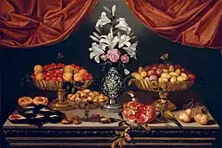 Jordan's Juan van der Hamen y León & the Court of Madrid was published in 2005, summarizing results of his work of over 40 years on van der Hamen.[44] Jordan focused on van der Hamen's role in the court of Philip IV during the 1620s, discussed his place among significant Spanish Baroque painters, and emphasized on his versatility by assessing his portraits and history paintings alongside his acclaimed still life work.[45] He curated an eponymous exhibition — the first monographic exhibition on van der Hamen — at the Patrimonio Nacional in Madrid and Meadows Museum in 2005–06.[46] The work was well received by art historians, with praise for Jordan's depiction of van der Hamen's complete artistic output and impact on the Spanish Golden Age.[47] However, there were reservations about the extent of artistic merit Jordan assigned to van der Hamen's portraits and history paintings.[48]