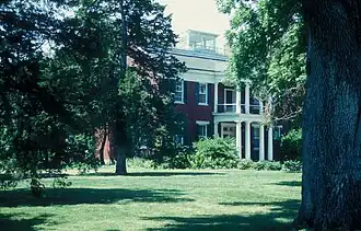 William B. Sappington House, also known as Prairie Park, is a historic home located near Arrow Rock, Saline County, Missouri. It was built in 1843, and is a 2+1⁄2-story, square, Greek Revival style brick dwelling on a limestone foundation. It measures 60 feet wide. The front facade features a two-story front portico with Doric order and Ionic order columns. Its roof is topped by a roof deck and cupola. The house was extensively restored from 1948 to 1955.[2]: 2, 4
