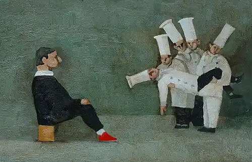 Balthazar began painting the series that he calls ‘Cooks’ in 1991. The first examples were painted on small wooden panels and usually included a larger figure sitting to one side. Often inspired by medieval painting there is a comic quality to these painting which despite their origins in religious iconography speak of humanity’s eternal role as actors on the stage of life, sometimes play acting with great humour and other times acting out the gravest of tragedies.[9] He has had solo shows alongside Howard Hodgkin and Wolf Kahn as well as group exhibitions with Alberto Sughi, Adriano Alumni, Mario Tozzi and Ottone Rosai.