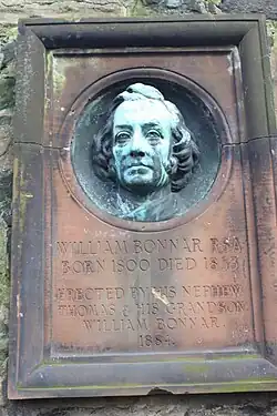Bonnar died at Edinburgh in 1853 and is buried in St Cuthbert's Kirkyard in Edinburgh. His monument is almost identical to that of his father in Dean Cemetery who had died only a few years earlier, and is therefore presumed to be by David Watson Stevenson. Both his sister Elizabeth and his daughter Elizabeth are buried elsewhere in the graveyard, both in the Kemp grave. William's sister, Elizabeth Bonnar (1808-1889) married George Meikle Kemp. He named his daughter Elizabeth (1826-1879) after his sister.