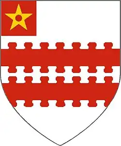 Brokesby of Shoby arms:- argent, 2 bars nebuly gules, on a canton gules a mullet pierced or.[1]