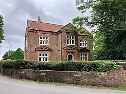 Sir John Nelthorpe commissioned this school from William Catlyn and the contract for building the school was drawn up on 4 July 1674 and it was completed in 1678. A tall, single storeyed front of seven bays and stone quoins. The centre emphasised by Ionic pilasters and stone capitals. The entrance door has a moulded stone round-headed architrave with a small keystone with a cherub's head. Brick pilasters with a plinth and Roman Ionic capitals in stone. Central achievement of arms in stone frame above an inscription commemorating foundation by Sir John Nelthorpe. Modern brick modillion pediment above.[6]