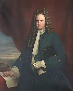 After her death in 1721, he married Jeanne Bernon (1696–1752) in Providence, Rhode Island on October 11, 1722.[7] She was a daughter of wealthy French Huguenot merchant Gabriel Bernon and Esther (née LeRoy) Bernon.[9] Jeanne had been born in La Rochelle, France and her father had helped establish the Cathedral of St. John in Providence.[10] Together, they were the parents of:[11]
