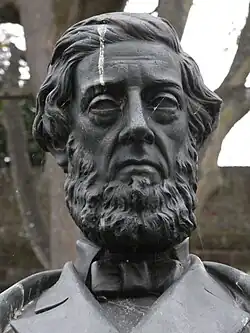 A bronze statue was made of the Earl by the Exeter sculptor Edward Bowring Stephens[4] and in October 1880[5] was erected at the front of the central garden in Bedford Circus, Exeter, on the spot where Stephens' "The Deer Stalker" had formerly stood. (The latter statue now stands near the Earl's statue, both having been re-located in Northernhay Gardens). The unveiling ceremony was attended by Sir Stafford Northcote (1818–1887), later Lord Lieutenant of Devon 1886–7, (whose own statue in Northernhay Gardens now stands nearby) with the Mayor and Corporation, other dignitaries and the Earl himself. The statue was paid for by public subscription to the Devon Statue Fund, which had attracted 1,300 signatories for this work. A banquet was held following the unveiling ceremony. The plinth is of Cornish granite from the Cheesewring Quarries, on the rear of which a bronze plaque is affixed inscribed with verse from Wordsworth's Happy Warrior: