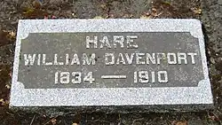 In 1859, William D. Hare married Henrietta Scholfield, and they had six children—Joseph C. Hare, Frances Ellen Hare, Martha G. Hare, Henrietta Hare, Ruth Hare, and William G. Hare who also served in the legislature.[1][8] Scholfield, who died in 1890, was the sister of Illinois Supreme Court Justice John Scholfield.[9] After her death, Hare's second marriage was to Mary A. Anthony in 1893, and she died in 1908.[1][9] She was a cousin of Susan B. Anthony.[9] He was a member of the Masonic Order and the Ancient Order of United Workmen.[2] As a Mason, he was selected as Grand Master of the Oregon chapter in 1871.[9] William Davenport Hare died in his home in Hillsboro on February 6, 1910, at the age of 75 and was buried at the Hillsboro Pioneer Cemetery.[2][9][10]
