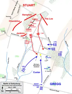 On July 3, Miller was given orders to hold his company "at all hazards"[9] in the woods north of the Lott house and assist the 1st New Jersey Cavalry Regiment in repelling Brigadier General Wade Hampton's advance.[5] When the enemy brigade advanced, Miller noticed a large contingent led by Confederate Brigadier General Fitzhugh Lee threatening to break through a main section of the Union line.[8] From his flank position he decided to disobey his orders and attack the Confederate from the side and stated to his adjutants, "I have been ordered to hold this position, but, if you will back me up in case I am court-martialed for disobedience, I will order a charge."[8][10] With full company agreement, Miller led his men into the flank of the Confederate advance causing confusion among the rebels who believed their retreat path was about to be cut off.[9] Because of Miller's surprise attack, the Confederate rear line was dispersed,[5][11] and the Union line saved.[3][10] During the melee, Miller was shot through the right arm.[2] After the fighting, Colonel John Baillie McIntosh, who had attacked the Confederate charge from the opposite flank, congratulated Miller on his attack.[5]