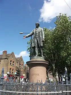 Although born and raised in Liverpool, William Gladstone was of purely Scottish ancestry.[11] His grandfather Thomas Gladstones was a prominent merchant from Leith, and his maternal grandfather, Andrew Robertson, was Provost of Dingwall and a Sheriff-Substitute of Ross-shire.[9] His biographer John Morley described him as "a highlander in the custody of a lowlander", and an adversary as "an ardent Italian in the custody of a Scotsman". One of his earliest childhood memories was being made to stand on a table and say "Ladies and gentlemen" to the assembled audience, probably at a gathering to promote the election of George Canning as MP for Liverpool in 1812. In 1814, young "Willy" visited Scotland for the first time, as he and his brother John travelled with their father to Edinburgh, Biggar and Dingwall to visit their relatives. Willy and his brother were both made freemen of the burgh of Dingwall.[12] In 1815, Gladstone also travelled to London and Cambridge for the first time with his parents. While in London, he attended a service of thanksgiving with his family at St Paul's Cathedral following the Battle of Waterloo, where he saw the Prince Regent.[13]