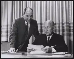 William Ballhaus, Sr. (standing) with Arnold O. Beckman of Beckman Instruments
