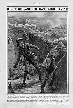 ..when holding the north-west corner of "The Vineyard" against heavy attacks by the Turks, Lieutenant Forshaw not only directed his men but personally threw bombs continuously for over 40 hours. When his detachment was relieved, he volunteered to continue directing the defence. Later, when the Turks captured a portion of the trench, he shot three of them and recaptured it. It was due to his fine example and magnificent courage that this very important position was held.[1]