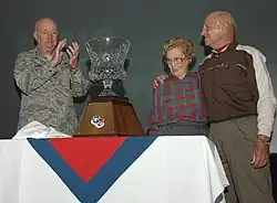 Major General Thomas F. Deppe (left) applauds at the unveiling of the Brigadier General William G. King trophy for the command's best systems wing. King (right) and his wife Mary are seeing the trophy for the first time.