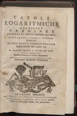 - ^ Gardiner, William (1796). Tavole logaritmiche (in Italian). Florence: Pietro Allegrini & Gioacchino Pagani.