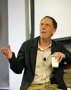 Gibson at an Amazon Fishbowl online talk show in Seattle, Washington, 2007-08-06. Gibson is a frequent guest speaker at conferences and symposia.