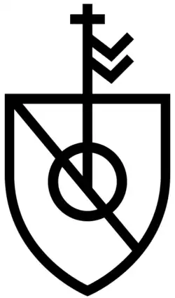 In each pediment is Greville's merchant's mark, being a cross standing on a globe, and two streamers attached to the shaft. On either side of the ledger stone and from the middle rise pinnacles. Between the finials and pinnacles are four heraldic shields, all displaying the arms of Greville: Sable, on a cross engrailed or five pellets a bordure engrailed of the second a mullet of the second in the dexter quarter for difference. These arms are today borne by the Greville Earls of Warwick, but undifferenced by a mullet. It is very unusual to find both a merchant's mark and a coat of arms on the same monument,[37] as the social classes of merchant and gentry were distinct. The two outer pinnacles are continued down till their bases from the extremity of the diapered band at the bottom upon which the figures stand. The centre pinnacle has a foliated capital and is continued till its base rests on the diapered band.