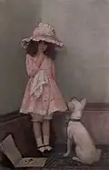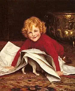 Gore was a Victorian genre painter of children and animals. Genre painting is a term that refers to the depiction of everyday life and was immensely popular in the late Victorian period. Gore’s painting of children and animals capture the excitement and playfulness of a Victorian child at play. They are affectionate and arresting but came to be seen by some critics as trite and sentimental.[12][2] Their reassessment took the best part of a century. The whereabouts of many of his genre paintings are unknown with some examples known only from photographs and sketches discovered at his studio in Newbury.[2] One of W.H.Gore’s most famous images is Forgive Us Our Trespasses exhibited at the Royal Academy in 1897. A little girl in a night-dress is kneeling against her bed saying her prayers. A small dog, possibly one of the terriers that Gore owned, is also kneeling seeking attention. It is an image that has been produced many times since in commercial settings. The West Berkshire Museum at Newbury in Gore’s home town owns two paintings A Pastoral Scene (1914) and The Culprit (1900), the latter an example of Gore’s genre painting of children.[13]