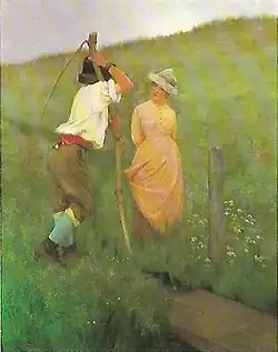 Many of W.H. Gore’s rural paintings display a nostalgic view of the nearby Kennet Valley and the surrounding Berkshire countryside. The influence of the French Barbizon School of realism and in particular the work of Jean-François Millet and François-Louis Français is evident in his work. The heyday of the Barbizon School was over by c 1870 but Gore incorporates some of the prominent features of the French school in the use of: colour, softness of form and in tonal qualities.[6] Two works by Millet The Angelus a painting of two figures standing during a contemplative moment and The Gleaners the latter portraying the figures toiling in the landscape were well known to late Victorians and their symbolic content influenced Gore in his depiction of rural life.[7] Paintings from the 1880s such as: Listed from the Guildhall collection in London and a watercolour In The Gloaming are intimate portrayals of Late Victorian romantic painting. Listed (sic) depicts two young lovers in sad reflection of the prospect of a young man joining up with his regiment. The ribbons in his cap refer to the custom of new recruits wearing their regimental colours to denote their willingness to be shot at for sixpence a day.[8] The pathos of the idea expressed moved H. Stacy Marks, R.A., who was a member of the Council of the Royal Academy, to tears such was its effect on his sensibilities. Marks reaction provides an insight into the mind-set of many Victorians.[9] In The Gloaming sees two lovers by the River Kennet in tender proximity to each other. These were themes that Gore returned to throughout his painting career.