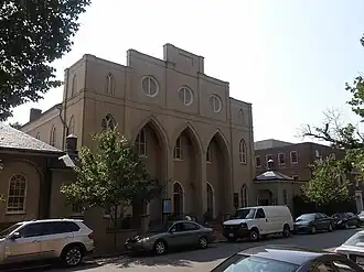 Wilmer and the Second Great Awakening revitalized the Episcopal Church in the Chesapeake Bay and Potomac River region. Wilmer helped Virginia's second bishop Richard Channing Moore, who he, Meade, Edmund Lee, and Bushrod Washington convinced to accept the position headquartered at Monumental Church in Richmond) reinvigorate it more broadly. The Evangelical Anglicanism movement of William Wilberforce as well as the moderation of Calvinist doctrine advanced by Charles Simeon influenced all these clergymen.[11] In 1814, Virginia's Episcopal priests and laity convened and formally elected Bishop Moore. During the diocesan convention, Wilmer delivered the first sermon at the newly rebuilt Monumental Church, followed the next Sunday by then Rev. Meade.[12] In June 1817, Wilmer's Alexandria congregation having outgrown its building, the cornerstone was laid for a new building, designed by Benjamin H. Latrobe of Baltimore and with an interior patterned after a Christopher Wren building (St. James Church, Piccadilly, London) and which would seat 600.[13] Through that summer and winter, Wilmer and Richard Baxter (a leading Jesuit of Georgetown University published a total of 53 learned letters under pseudonyms in the 'Alexandria Gazette' debating Evangelical Lutheran doctrine, which were collected and published together in 1818.[14]