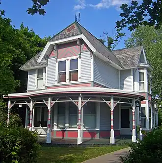 The house is a frame two-story three-bay home with a cross-gabled roof that comes to a jerkin shape in the front (west) side. A porch wraps around the first story to the south elevation. The south bay on the front side is projecting, with Stick-style decoration between the second-story window and roofline. On the south side is another projecting two-story bay with similarly tall bay window. The north profile features a round-arched stained glass window that illuminates a staircase.[2]
