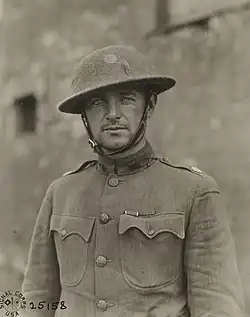 During World War I, Major Donovan led the 1st Battalion, 165th Infantry of the 42nd Division. Serving in France, he suffered a shrapnel wound in one leg and was almost blinded by gas. After performing a rescue under fire, he was offered the Croix de Guerre, but turned it down because a Jewish soldier who had taken part in the rescue had not also been awarded the honor. After that insult had been corrected, Donovan accepted the distinction.[17] He was awarded the Distinguished Service Cross for leading an assault during the Aisne-Marne campaign, in which hundreds of members of his regiment died, including his acting adjutant, the poet Joyce Kilmer.[18] The 1940 James Cagney movie, The Fighting 69th, dramatised the events of this battle and the 69th Infantry Regiment's role in it.