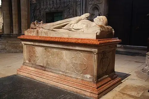His vigorous health suddenly broke in January 1894, and he died at the deanery on 14 January, and was buried on the 18th in the cloister garth of Lincoln Cathedral.[2] A monument east of the choir stalls in Lincoln Cathedral was unveiled on 25 April 1896. The monument by Farmer & Brindley is of red Verona marble with an alabaster effigy carved by Léon-Joseph Chavalliaud.[4] The south chapel of Wantage church was restored in 1895, "in thankful memory of W. J. Butler, 34 years vicar".