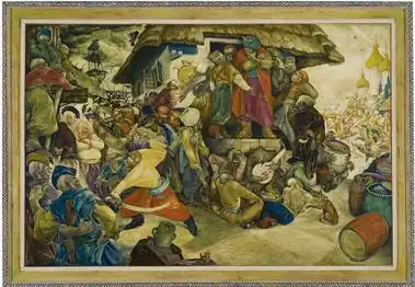 Kurelek's friends at the OCA told him about a School of Fine Arts in San Miguel, Mexico, which might grant him a scholarship if he produced something worthwhile.[16] Fired by the thought of studying with one of the great Mexican mural painters, he painted his first self-portrait.[17] Though he studied at the Ontario College of Art in Toronto and at the Instituto Allende in Mexico, he was primarily self-taught from books. Zaporozhian Cossacks, a gift to his father, is the last painting Kurelek did before leaving for Europe for the first time, and shows the influence of the Mexican muralists on his work.[18]