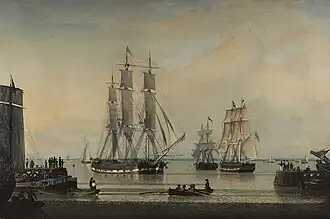 - ^ William Lee, Sheppard, master, sailed from Hull on 22 or 23 March 1838 and returned on 22 January 1839 to an enthusiastic reception from the people of Hull.[12] As she returned she was flying the red and white striped pennant of Joseph Gee, agent.[13]