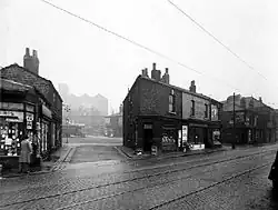 His father was William Scott, a joiner, born in Leeds in 1861.[13] His mother was Eliza Anne (or Eliza Annie) Scott nee Hibbard,[1] born in Nottinghamshire in 1864.[14][15] In 1891 the couple were living alone at 4 Clayfield Street in the All Souls parish of north Leeds,[16] and Eliza Anne was a tailoress. This street of Victorian back-to-backs ran between Cambridge Road and Ashfield Leather Works; the area is now a playing field.[17][18] This tannery would have been odiferous during smog or to houses downwind of it; also the nearby Meanwood Beck had in those days a history of industrial pollution. This may be the reason why William and Eliza Anne Scott took over the tobaconnist's from Samuel Cooper at 128 Camp Road in 1893 and their son was born there.[1][19][20][21][22]