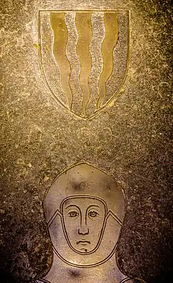 He died on 8 June 1425[3] and was buried in the church of St Giles at Stoke Poges.[1] On the north side of the altar on a memorial brass are the images of a knight and his lady, with their arms above and an inscription in Latin below: