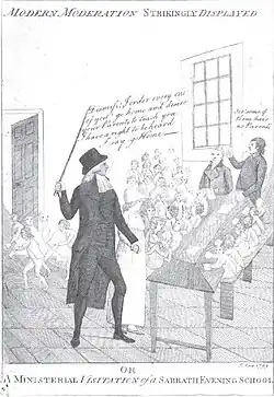 John Kay's caricature "Modern Moderation"[14] shows how seriously Moodie took this responsibility. When some Sabbath School teachers asked him to visit them to reassure them and him that they were law-abiding, orthodox Christians, he turned up, and without giving a moment's attention to them, told the pupils to leave immediately and their parent's would answer any questions. Later, in 1805, he was part of a group of Edinburgh clergy who opposed the appointment of John Leslie as Professor of Mathematics at the university, for holding views "destructive of all religion". In his "Essay on Heat" he had seemed to approve of some aspect of the work of sceptical philosopher David Hume. They pursued him through the Presbytery and the Synod up to the General Assembly. There was a tumultuous debate, for which the public queued for hours to get in, after which the Assembly dismissed the complaint against Professor Leslie.[15] There is a letter from Robert Burns to Moodie, defending his friend James Clarke, schoolmaster at Moffat against a charge of cruelty to his pupils.[16]