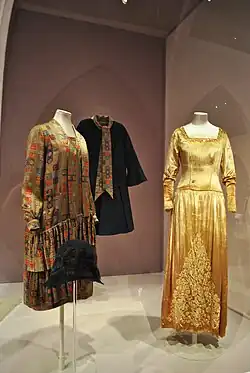 Marian Lasenby's wedding dress on the left, Victoria & Albert Museum