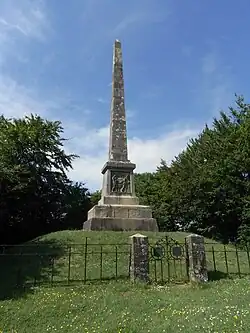 - Hatherleigh: in 1860 funded by public subscription an obelisk made from ashlar granite[39] was erected near Fishleigh on the north edge of Hatherleigh Moor in Devon, on a site with a spectacular view southwards towards Dartmoor.[40] On its base is a bronze relief sculpture by Edward Bowring Stephens inscribed BALAKLAVA, showing the wounded Morris being carried by three soldiers.[3][41] The decorative iron gates in front of the monument show the following inscription on two escutcheons: