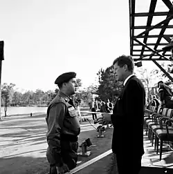 It was during his tenure as Commander of the Special Warfare Center that in 1961, he arranged for President Kennedy to visit Fort Bragg, the results were twofold - acquiring the funding to further develop the Special Forces into a strategic unit within the US Army and the more visible sign - the authorization of the Green Beret for wear as the official headgear of Special Forces.[18][19] Yarborough's design for the original parachutists uniform was incorporated into the 1963 Army tropical uniform that was later worn by all Army units in the Vietnam War.