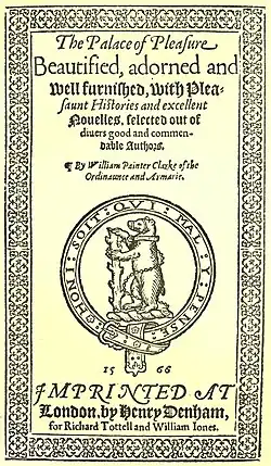 The Palace of Pleasure was edited by Joseph Haslewood in 1813. This edition was collated (1890) with the British Museum copy of 1575 by Joseph Jacobs, who added further prefatory matter, including some on the importance of the Italian novella in Elizabethan drama.[5]