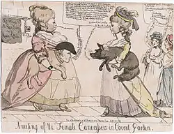 Carey produced some satirical and political engravings for the 1784 British general election, working with William Holland of Drury Lane.[30] In 1787 he turned to Ireland and the matter of religion, Arthur O'Leary and William Campbell, who had joined sides in controversy with Richard Woodward.[5][31] In 1789 he collected his political verse in The Nettle, aimed at the Marquess of Buckingham, and published it under the pseudonym "Scriblerus Murtough O'Pindar"[32][33] He did the copperplates in Geoffrey Gambado's (Henry William Bunbury's) Annals of Horsemanship (Dublin, 1792). He also made several plates for a collection of ethical maxims, the Morals of Horace translated by Elizabeth Grattan in Dublin in 1785.[1][4]