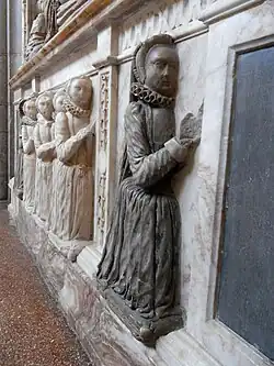 Monument to Mary Periham (1567–1605), eldest daughter of Sir William Peryam and 1st wife of Sir William Pole (1561–1635), in the Pole Chapel, Colyton Church, Devon, in which parish is situated Colcombe Castle. The escutcheons show the arms of Pole and Peryam. Text: Heere lieth ye body of Mary late ye wife of Sr. Wm. Pole of Shute knig. beinge ye eldest daughter & one of ye foure heires of Sr. W. Periham of Fulford knig. Lo. Chief Barron of ye Kinge majesties Exchequer. She left behind her 4 son(n)es & 5 daughters unto her saide husband viz John, Periham, Wil., & Franncis, son(n)es, Mary, Katherine, Elizabeth, Ane & Elioner, daughters. She brought unto him also 2 other son(n)es viz Wil., her first child & Arthur being on(e) of ye 3 son(n)es wi.ch she brought at on(e) birth & perished by an unfortunat fall. She dyed ye 2 of May in ye yeere of our Lord 1605 being then of th'age of 38 & on(e) moneth & maried unto her husband 22 yeeres tenn monethes