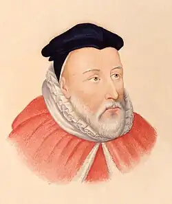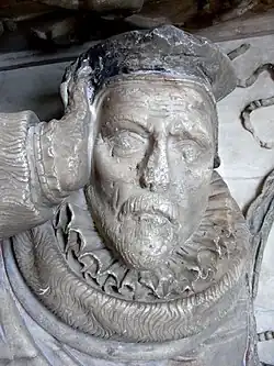 He died on 9 October 1604, in the year of his seventieth birthday, at his house at Little Fulford (renamed Shobroke Park in the early 1800s, demolished)[15] east of Crediton in Devon. His monument exists in Crediton parish church to the north of the chancel, showing a life-like effigy of his recumbent figure his head propped up on his hand. He had served at the Exchequer for eleven years and nine months, and his funeral and burial in Crediton Church appears to have been a significant event, as it was well attended, according to Prince not only by "The gentry, clergy, and others in these parts, but also with heralds at arms, marshalling all according to their rank and place".[3]