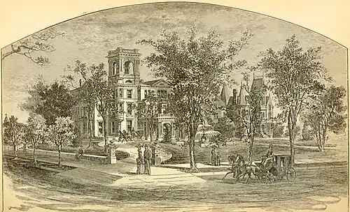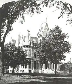 Wisconsin Avenue was originally named Spring Street, but after several mansions were built along the street, it developed into the most prestigious residential area for the wealthy and in 1876 was renamed Grand Avenue.[5] Known as "A Merchant Prince and Princely Merchant" for his philanthropy,[6] John Plankinton owned property between Fifteenth and Sixteenth Streets on Grand Avenue and here financed three residences: one for himself (the extensively remodeled James Rogers mansion at 625 N. Fifteenth Street along with its surrounding seven acres of parkland, purchased in 1865);[7] one immediately next door, to the east, for his son William and built in 1876;[4] and one across the street for his daughter Elizabeth built in 1886-88 (at 1492 W. Wisconsin Avenue).[8][9] Elizabeth never moved into her residence, and after William Plankinton died in 1905, his descendants moved to another location, since the neighborhood had undergone decline and Grand Avenue was no longer regarded as the city's most prestigious address.[4] Following discussions that began in 1913, it was finally renamed W. Wisconsin Avenue in 1926.[10]