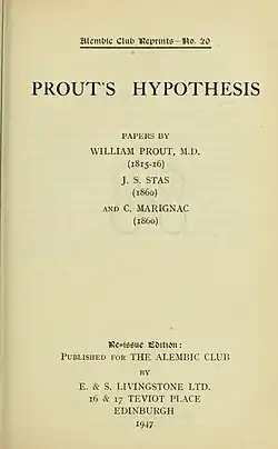 • Prout, William (1947). Prout's hypothesis. Edinburgh: Livingstone.