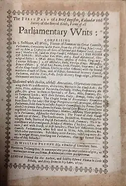 - ^ William Prynne (1659). The first part of a brief register, kalendar and survey of the several kinds, forms of all parliamentary vvrits: comprising in 3. sections, all writs, forms of summons to great councils, parliaments, convocations in the Tower, from the 5th of King John (1203) till 23 Edw 4. (1483) to all sorts of spiritual and temporal Lords, greatmen (members of,) and the Kings council (assistants to) the House of Lords: with other rare writs, and 4. exact alphabetical, chronological tables: 1. Of all abbots, priors, masters of orders, clergy-men, (except bishops:) 2. Of all dukes, earls, forreign kings, marquesses, princes of Wales: 3. Of all lay-barons, lords, vicounts, great men: 4. Of all the Kings council (justices, clerks, or other officers) with the several numbers of each of them, and of bishops, summoned to every council, parliament, and the years, rolls, dorses in every kings reign, wherein their names are recorded. Illustrated with choice, usefull annotations, observations concerning these writs differences, alterations, entries in the clause rolls: the stiles, titles, additions of patriarcha, cardinalis, electus, confirmatus, magister, &c given in them to spiritual; ... With other particulars. Publishing more rarities, rectifying more errors in vulgar writers, touching our parliaments, than any former treatises of this subject. By William Prynne Esq; a bencher of Lincolnes Inne (1st ed.). London: Printed for the author, and sold by Edward Thomas in Little Britain, and Henry Brome in Ivy-Lane. OCLC 83751432.