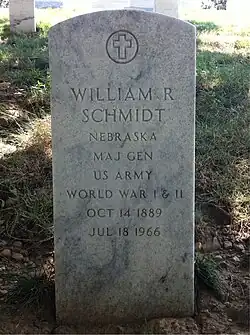 Major General William Schmidt retired from the army, after 38 years of service, in 1951 and died at the age of 76 on July 18, 1966, in Walter Reed Army Medical Center in Washington, D.C.[4] He was buried at Arlington National Cemetery, Virginia, together with his wife Helen Munn Goodier, with whom he had two daughters.