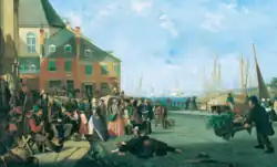Like Paul Kane and Cornelius Krieghoff, Raphael was known for his paintings of the habitant and First Nations peoples.[3] In 1866, Raphael painted Immigrants at Montreal, later titled Behind Bonsecours Market, purchased by the National Gallery of Canada in 1957. The artist portrayed himself in the painting: he is the man in the crowd carrying a portfolio and a five-pronged candlestick, perhaps inherited from his family[3] (presumably, he was painting what he brought as an immigrant to the New World). He worked and exhibited with the Society of Canadian Artists in Montreal (1867), of which he was a founder, the Art Association of Montreal, the Ontario Society of Artists (member in 1879), and the Royal Canadian Academy of Arts, of which he was a charter member.[7][8] He also exhibited his work at the Centennial Exposition in Philadelphia in 1876, the Royal Society of British Artists in 1877–1878 and at the Colonial and Indian Exhibition in London in 1886.[3] In 1996, Galerie Walter Klinkhoff in Montreal organized a retrospective of his work.[9]