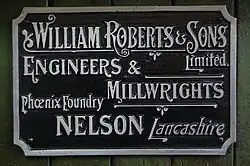 William Roberts and Company (later William Roberts and Sons) of Phoenix Foundry in Nelson, Lancashire, England, produced many of the steam engines that powered cotton weaving and spinning mills of Pendle and neighbouring districts.[1] Industrial historian Mike Rothwell has called Phoenix foundry “Nelson’s most significant engineering site”.[2]