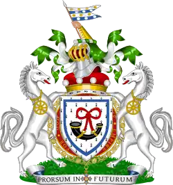 On a wreath Argent and Vert a cubit arm bendwise in armour Or the hand Proper grasping a spear in bend also Proper flying therefrom a forked pennon barry Argent and Azure semée of plates and bezants.
